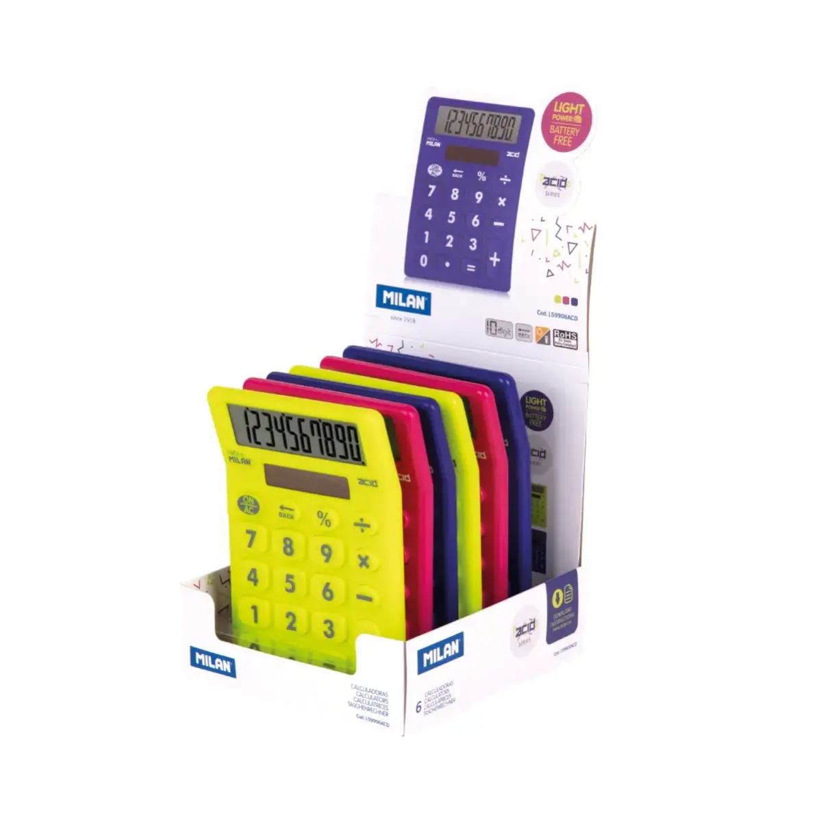 Calculadoras de sobremesa de 10 dígitos y teclas grandes. Serie Acid. Tecla de rectificación de entrada de datos. Alimentación solar. Apagado automático. Medidas calculadora: 14,5 x 10,6 x 2,1 cm. 3 colores Acid surtidos: azul, amarillo y rosa. Diseño original creado por el departamento de I+D de MILAN.